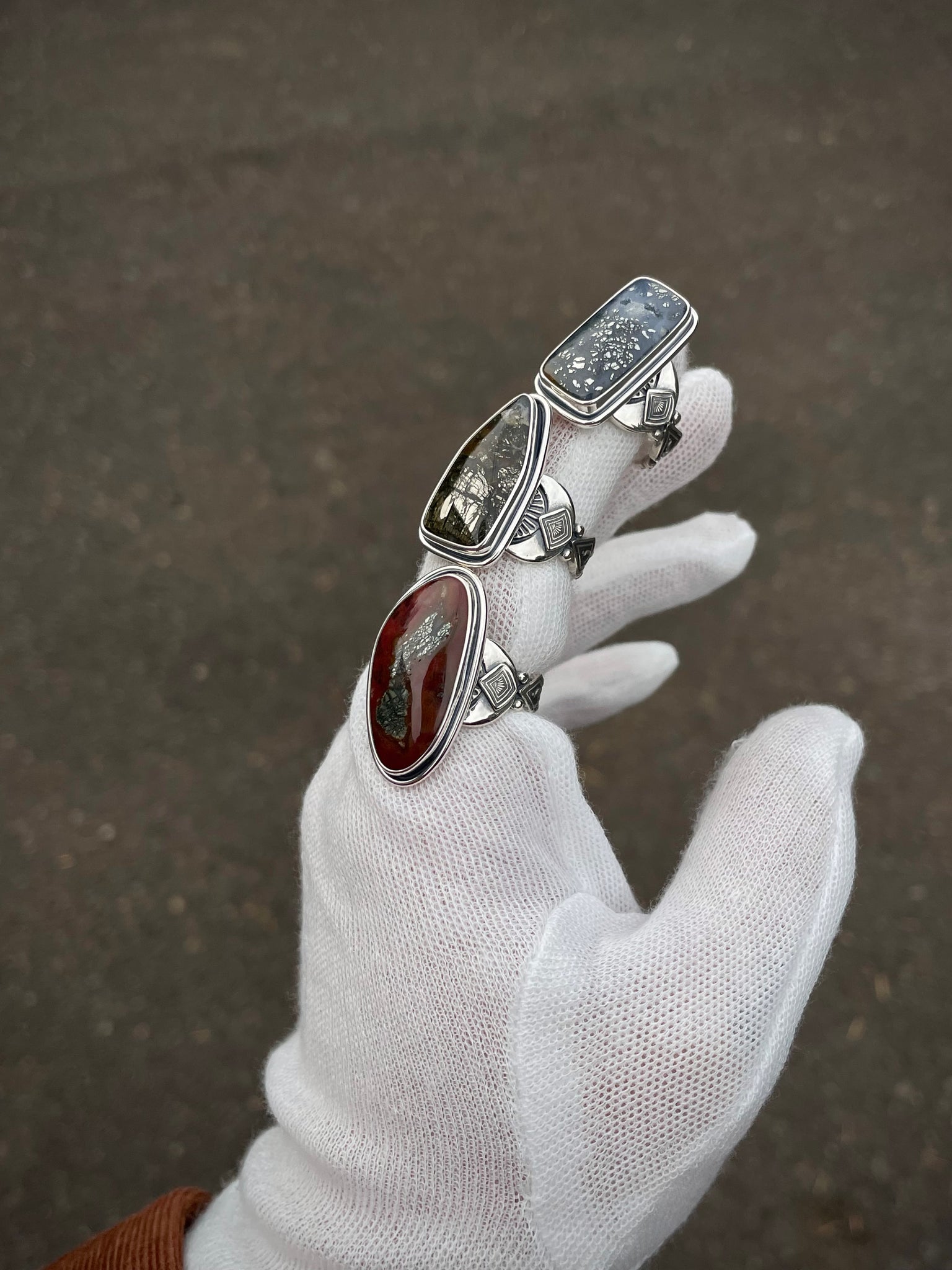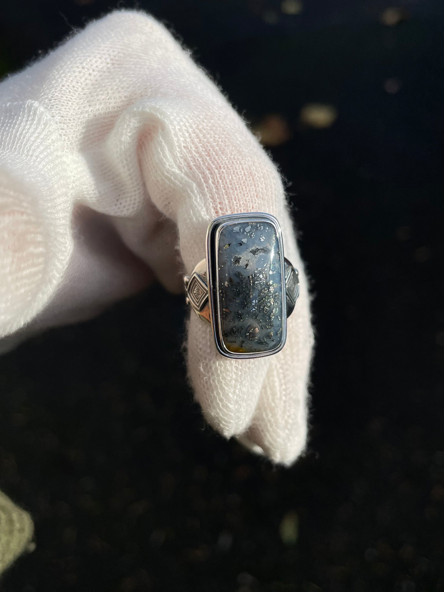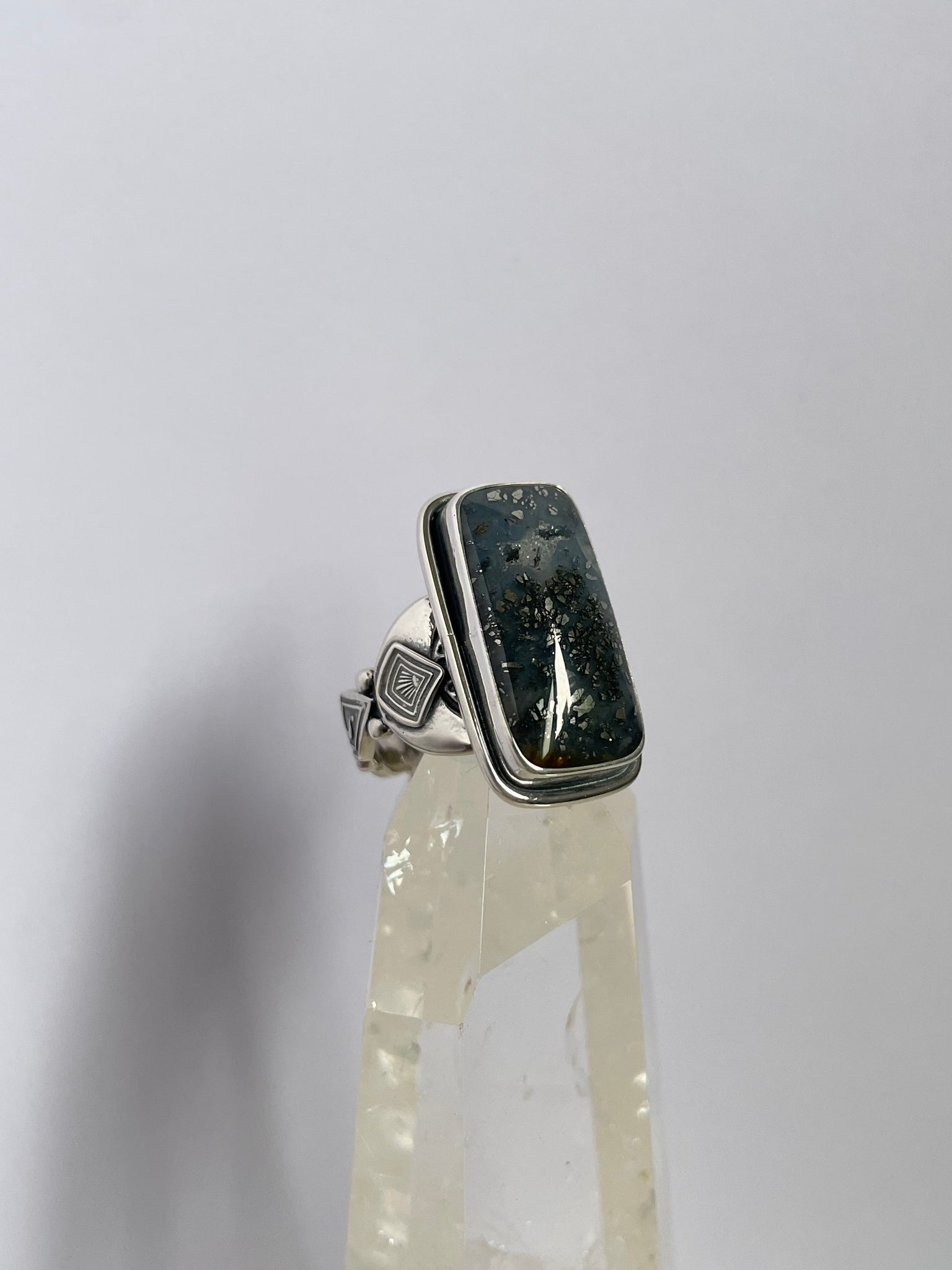 This pyrite packed, flashy piece of Marcasite was sourced here in PDX by a local lapidary artist and designed by yours truly! This stunning ring features a highly embellished ring band that was casted in house. This ring is signed and marked .925. I just love this material so much, it showcases so much depth and concentrated color! I’ve photographed this ring in multiple sources of light to show an accurate representation of the stones color. This ring fits a size 7.5 best, thanks so much for looking.