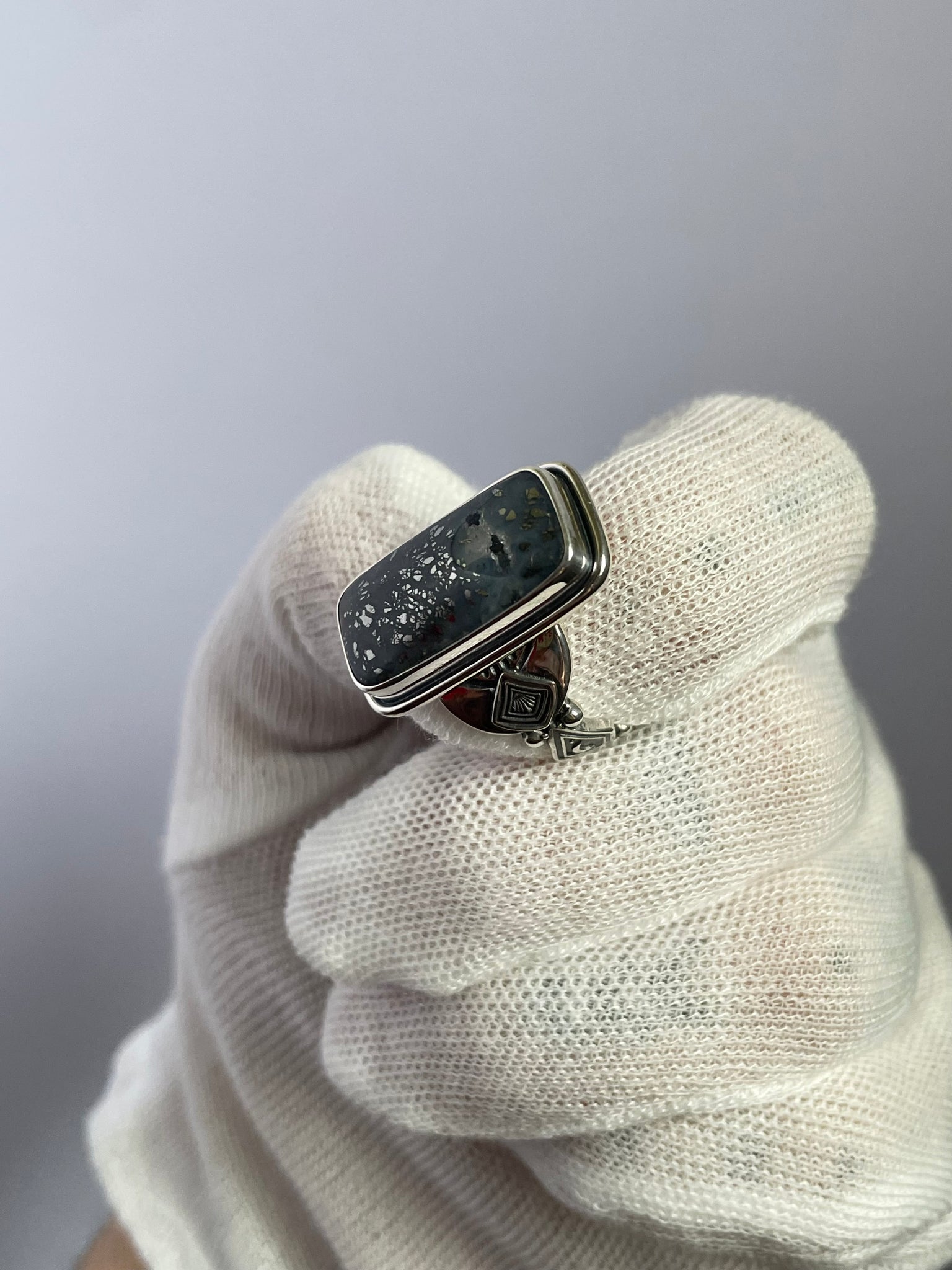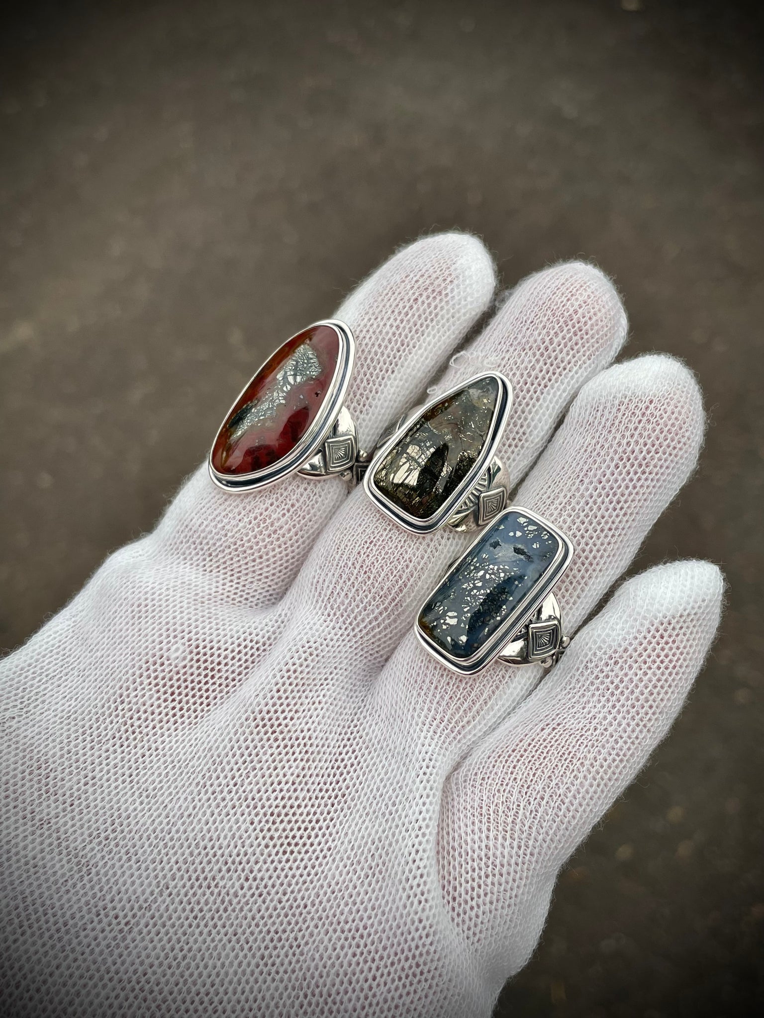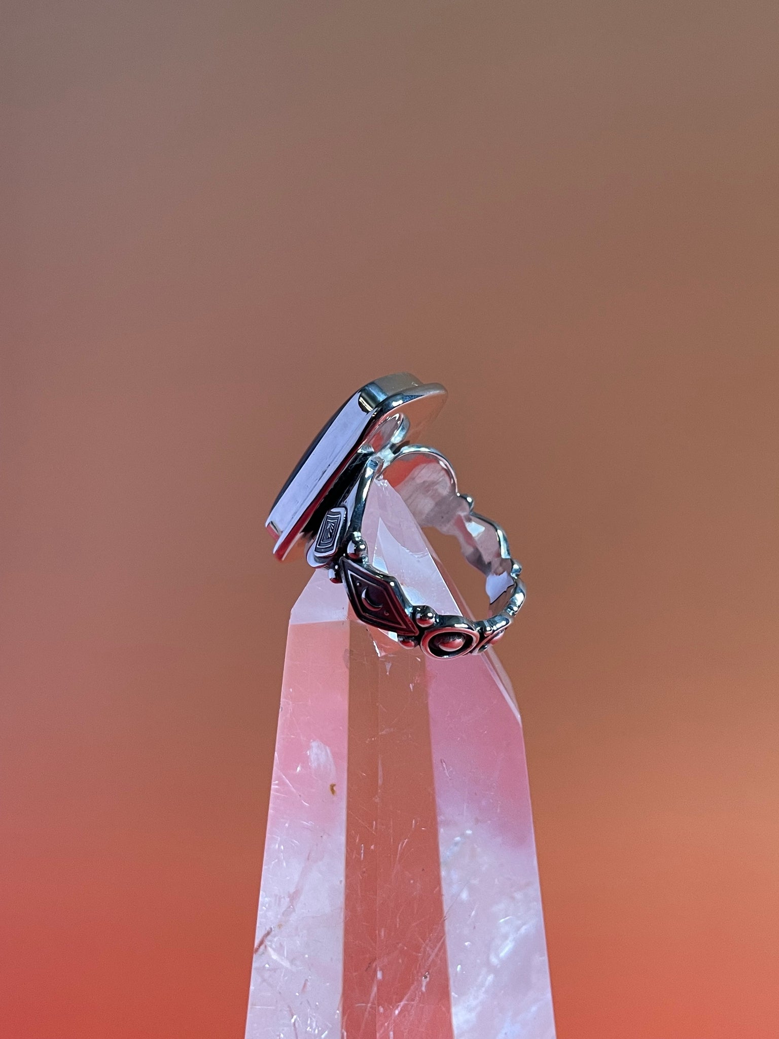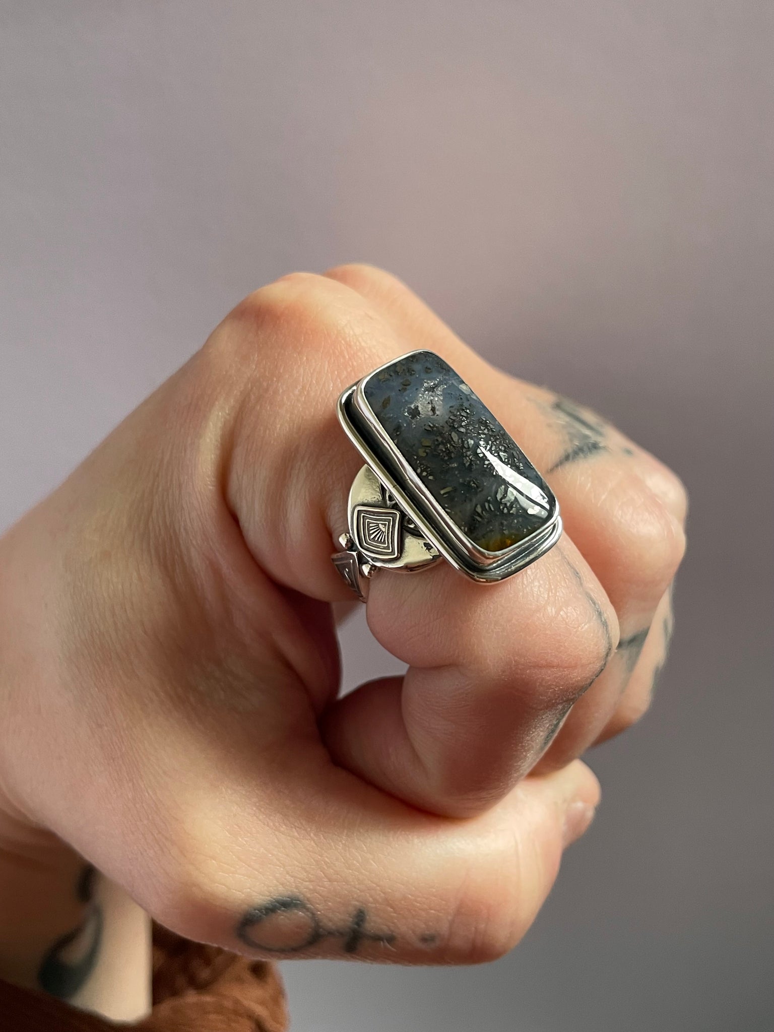 This pyrite packed, flashy piece of Marcasite was sourced here in PDX by a local lapidary artist and designed by yours truly! This stunning ring features a highly embellished ring band that was casted in house. This ring is signed and marked .925. I just love this material so much, it showcases so much depth and concentrated color! I’ve photographed this ring in multiple sources of light to show an accurate representation of the stones color. This ring fits a size 7.5 best, thanks so much for looking.