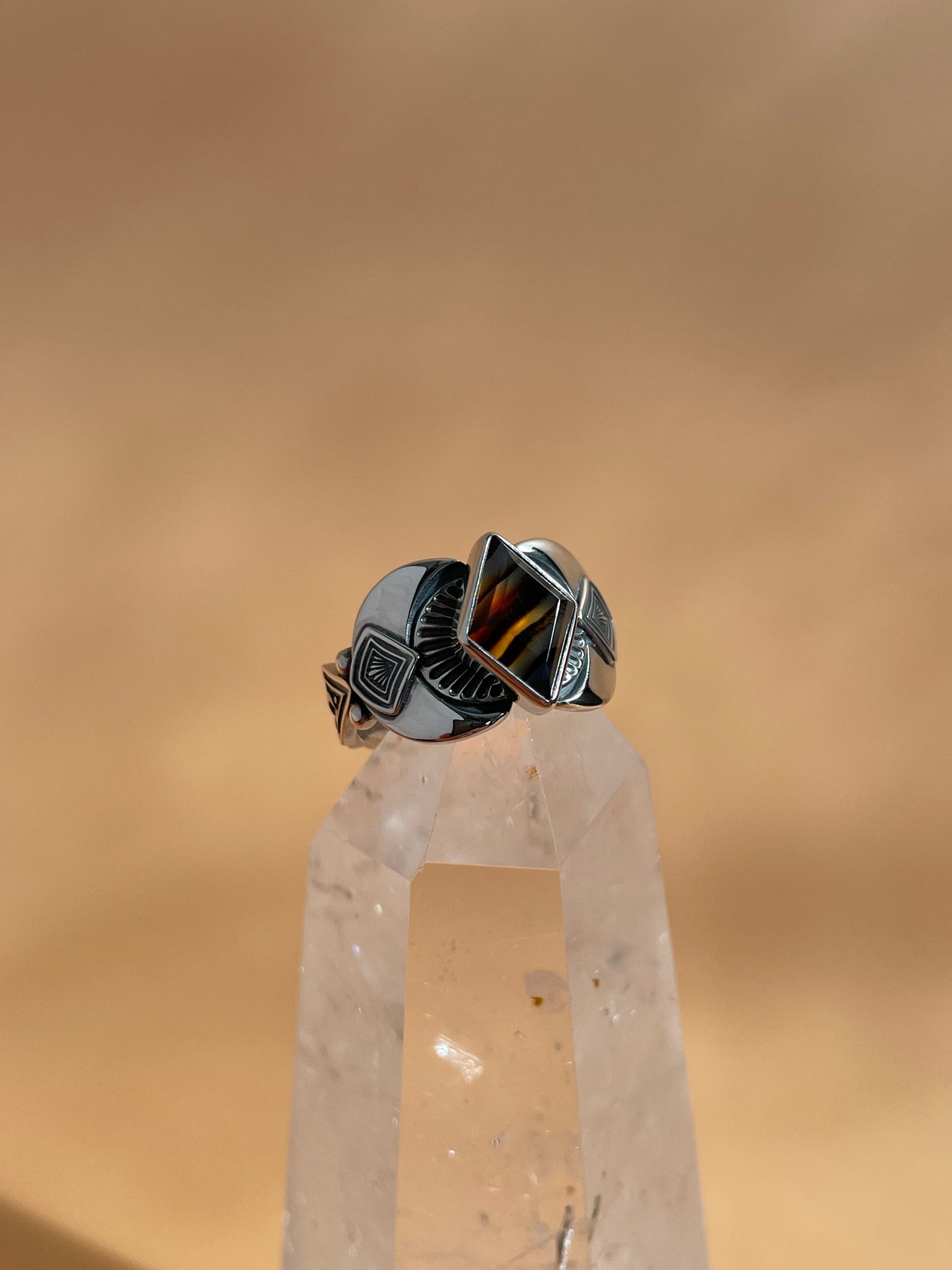 This stunning step-cut Montana Agate ring was completely hand fabricated here in my Portland studio. This stone is extremely flashy and is truly one of a kind! All these photos have been taken in Natural lighting, inside and outside so you get a true representation of the stones color! This ring fits a size 8.25 best. This piece has been marked .925 and is signed by yours truly! Thank you so much for looking, please reach out to me on Instagram with additional questions.